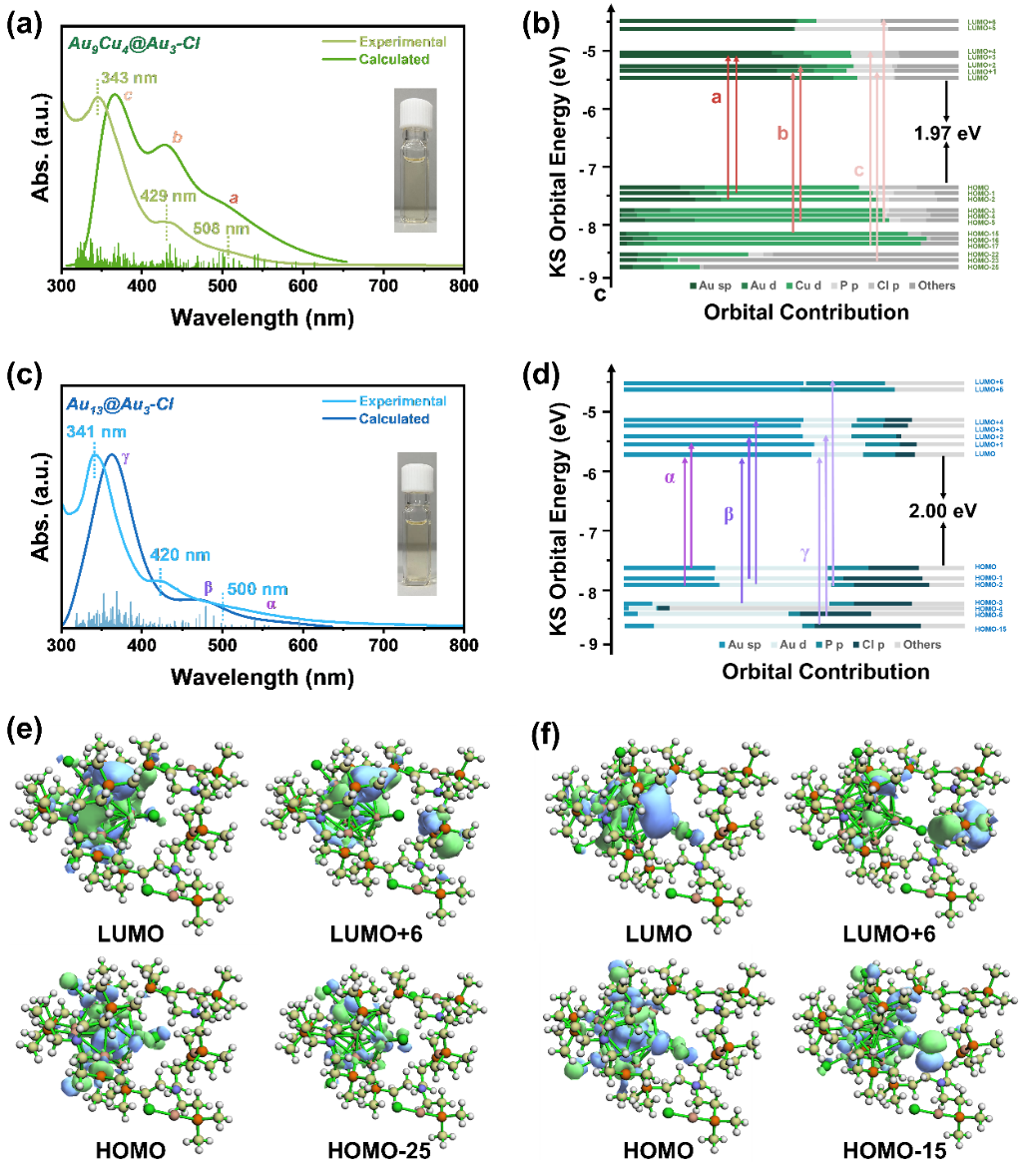 图2. (a)Au9Cu4@Au3-Cl和(c)Au13@Au3-Cl的UV-vis吸收光谱。(b)Au9Cu4@Au3-Cl和(d)Au13@Au3-Cl的Kohn–Sham分子轨道分析。(e)和(f)代表性的HOMO-LUMO优化结构(isovalue = 0.020)。