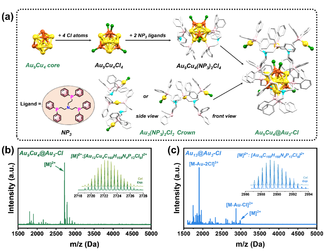 图1. (a)Au9Cu4@Au3-Cl的结构分析。Au9Cu4@Au3-Cl(b)和Au13@Au3-Cl(c)的高分辨质谱分析。