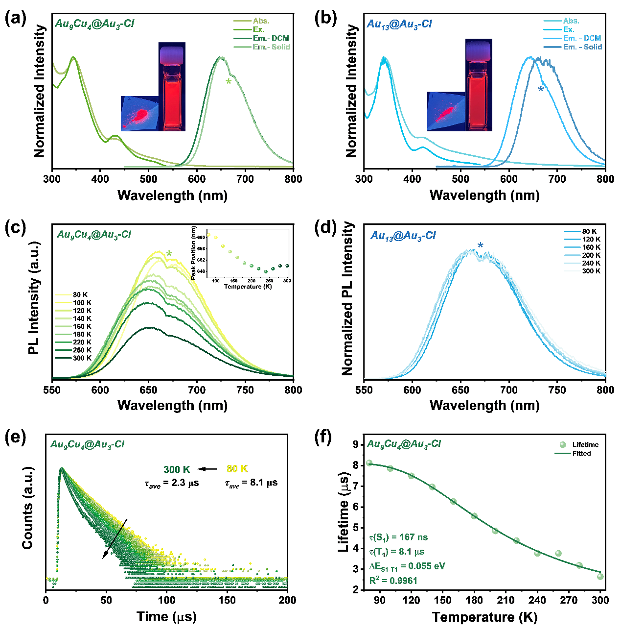 图3. Au9Cu4@Au3-Cl(a)和Au13@Au3-Cl(b)的常温发射和激发谱图。Au9Cu4@Au3-Cl(c)和Au13@Au3-Cl(d)从80 K至300 K发射谱图。(e)Au9Cu4@Au3-Cl升温过程中的寿命衰减曲线。(f)Au9Cu4@Au3-Cl的平均寿命与温度的拟合曲线。