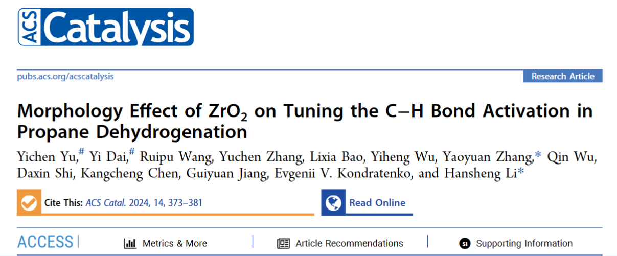 近日,北京理工大学化学与化工学院黎汉生教授团队在ZrO2形貌调控对丙烷脱氢反应中C−H键活化方面取得重要进展。相关研究成果以“Morphology Effect of ZrO2 on Tuning the C−H Bond Activation in Propane Dehydrogenation”为题,在催化领域顶级期刊《ACS Catalysis》上发表(DOI:10.1021/acscatal.3c04883)。该工作以北京理工大学为第一通讯单位,黎汉生教授和张耀远预聘助理教授为共同通讯作者,硕士研究生于宜辰和代怡为该论文的共同第一作者。